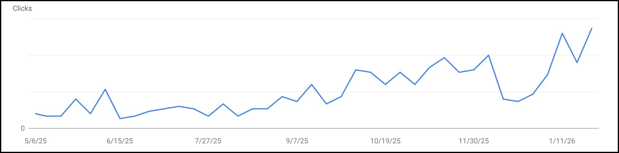 From May 2025 to January 2026, the website went from zero organic clicks per day to 40+ clicks per day