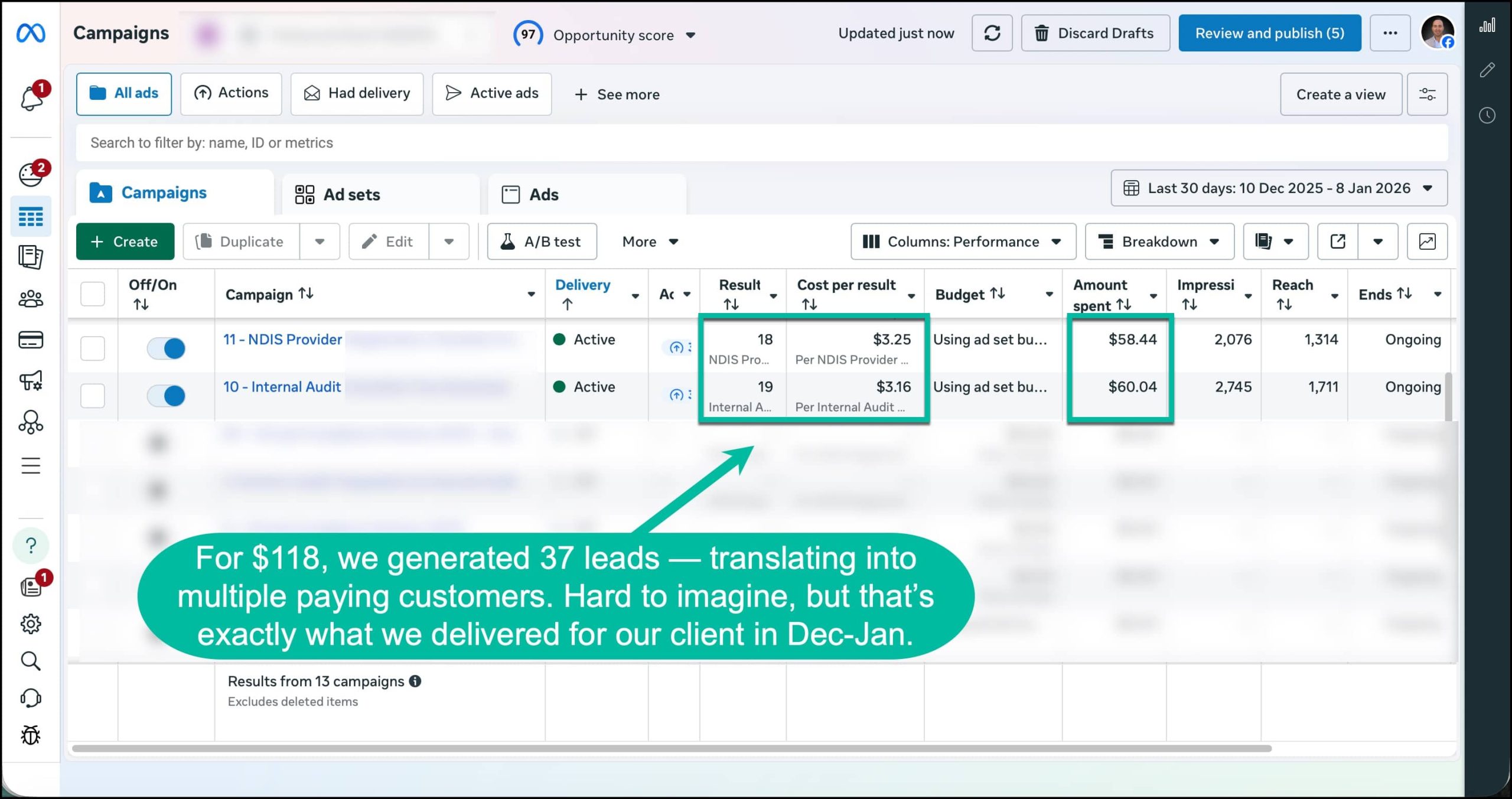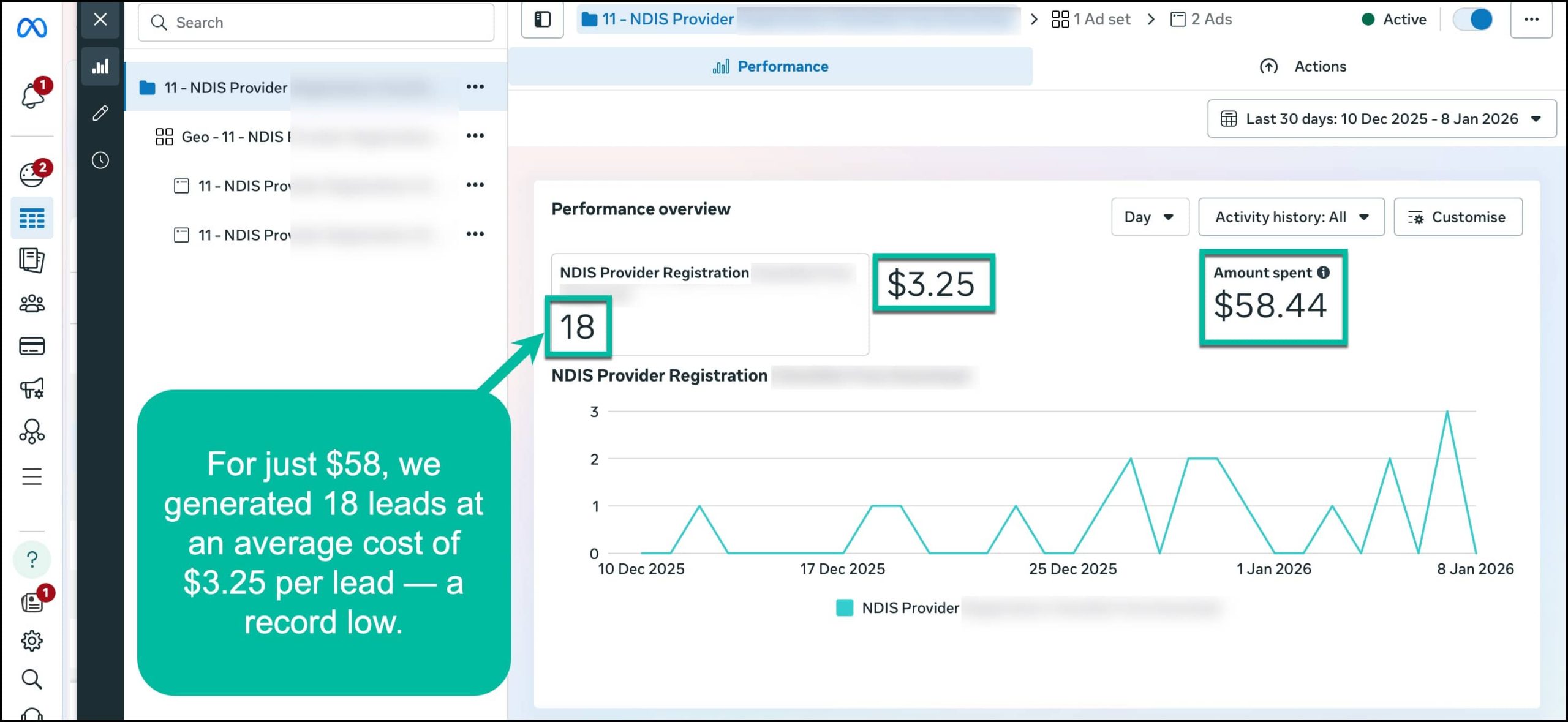 I’ve attached a few real campaign screenshots from December 2025 – January 2026 showing the results achieved for NDIS-related services using a daily budget of just $2 per day.